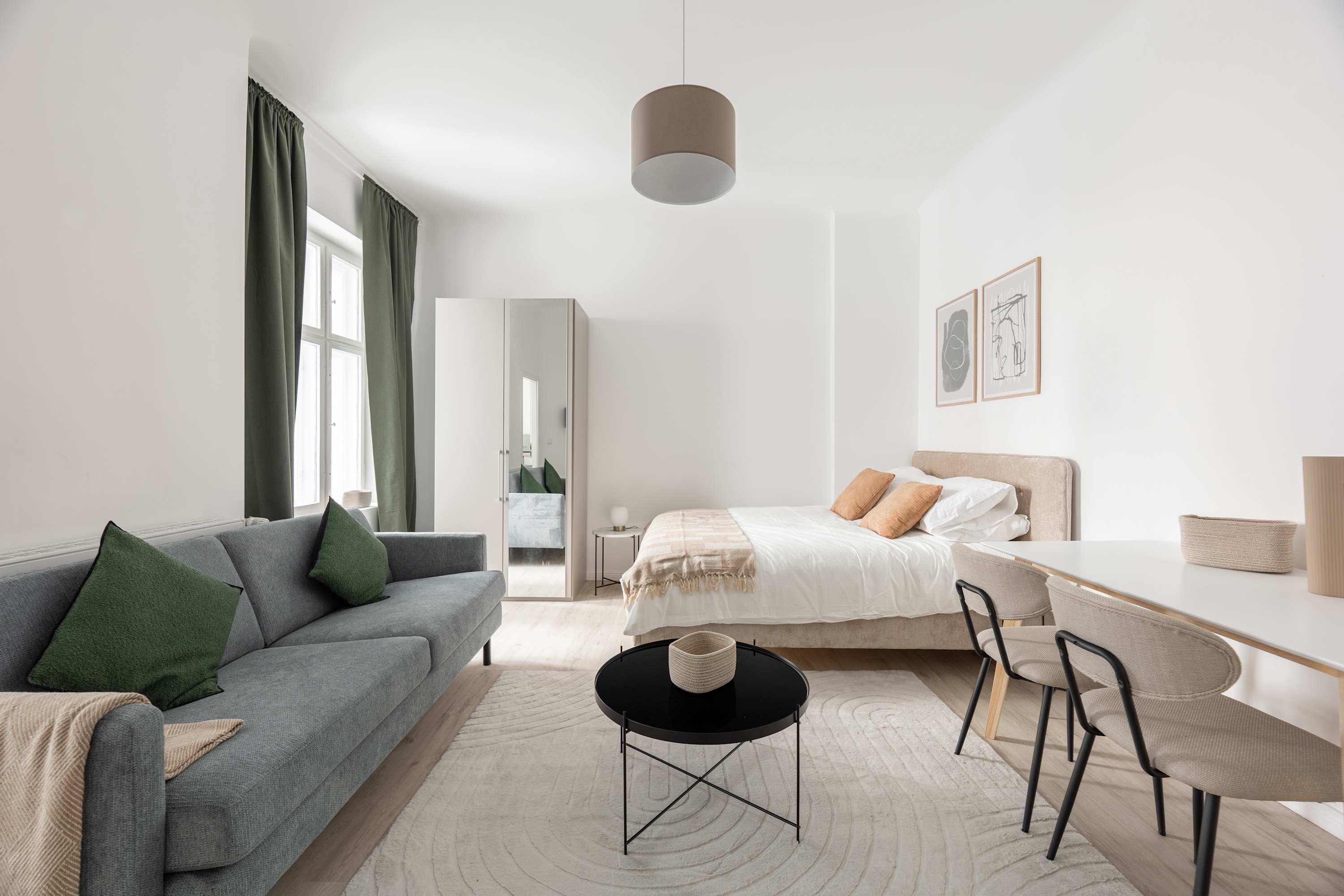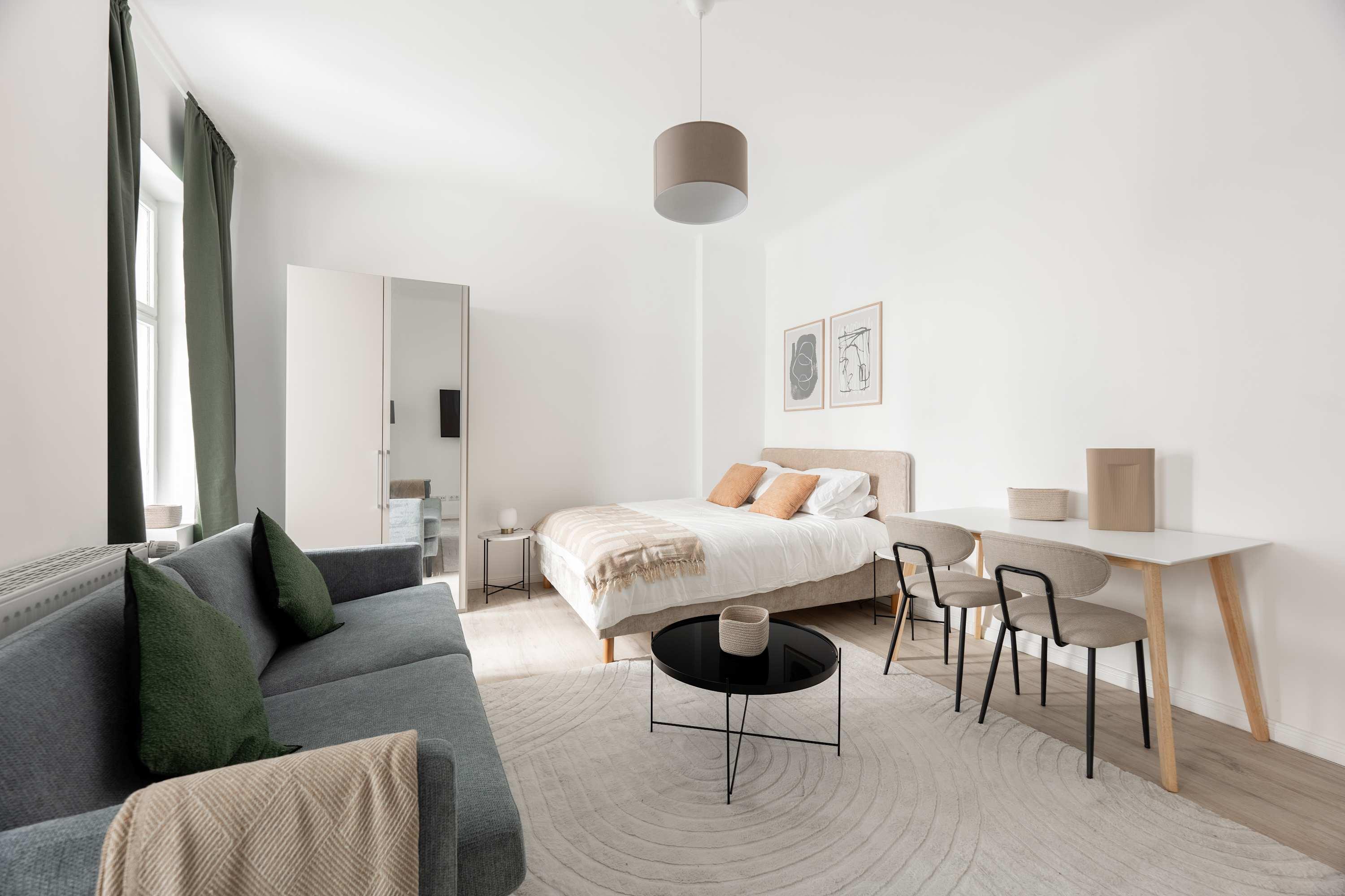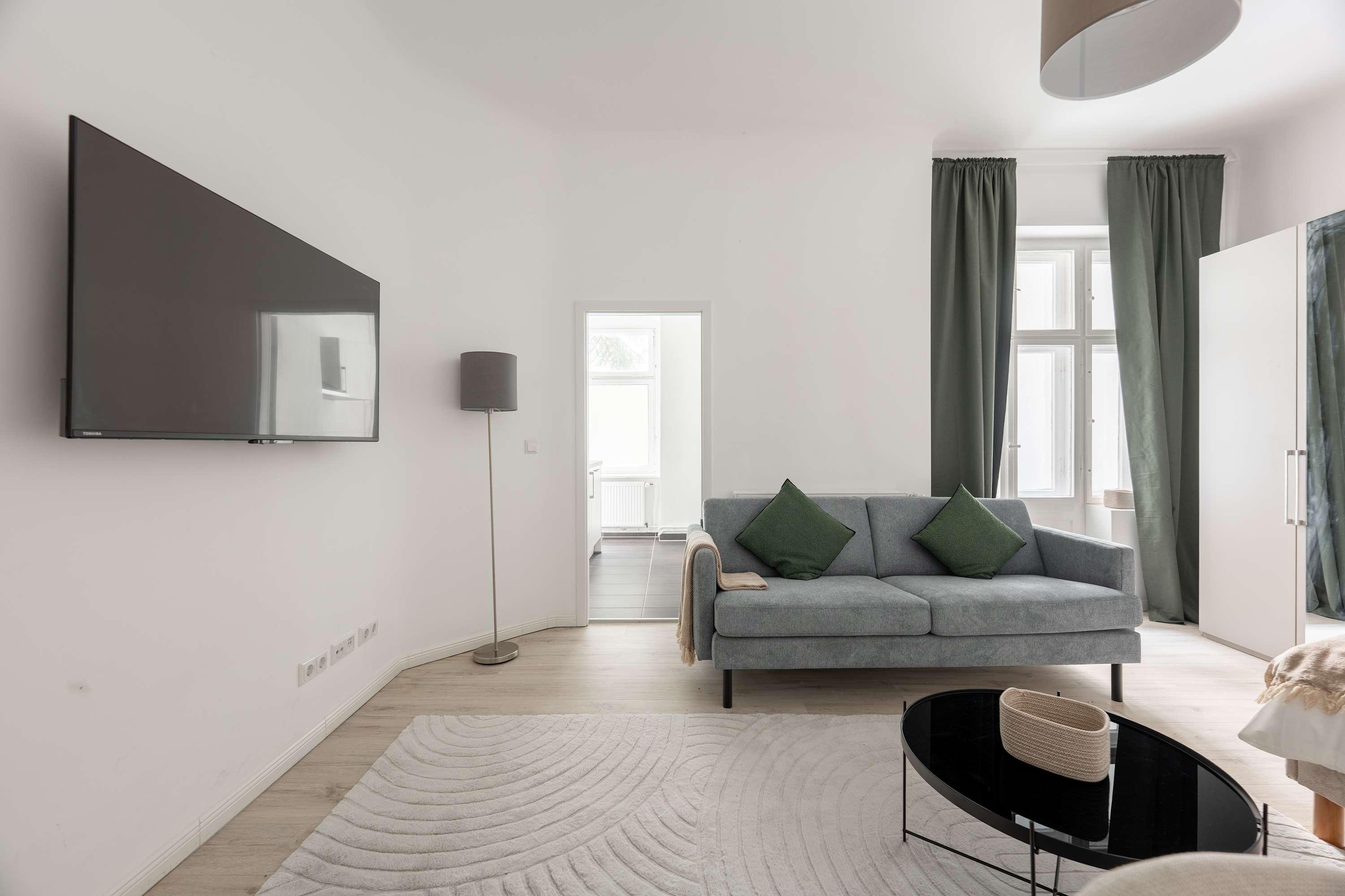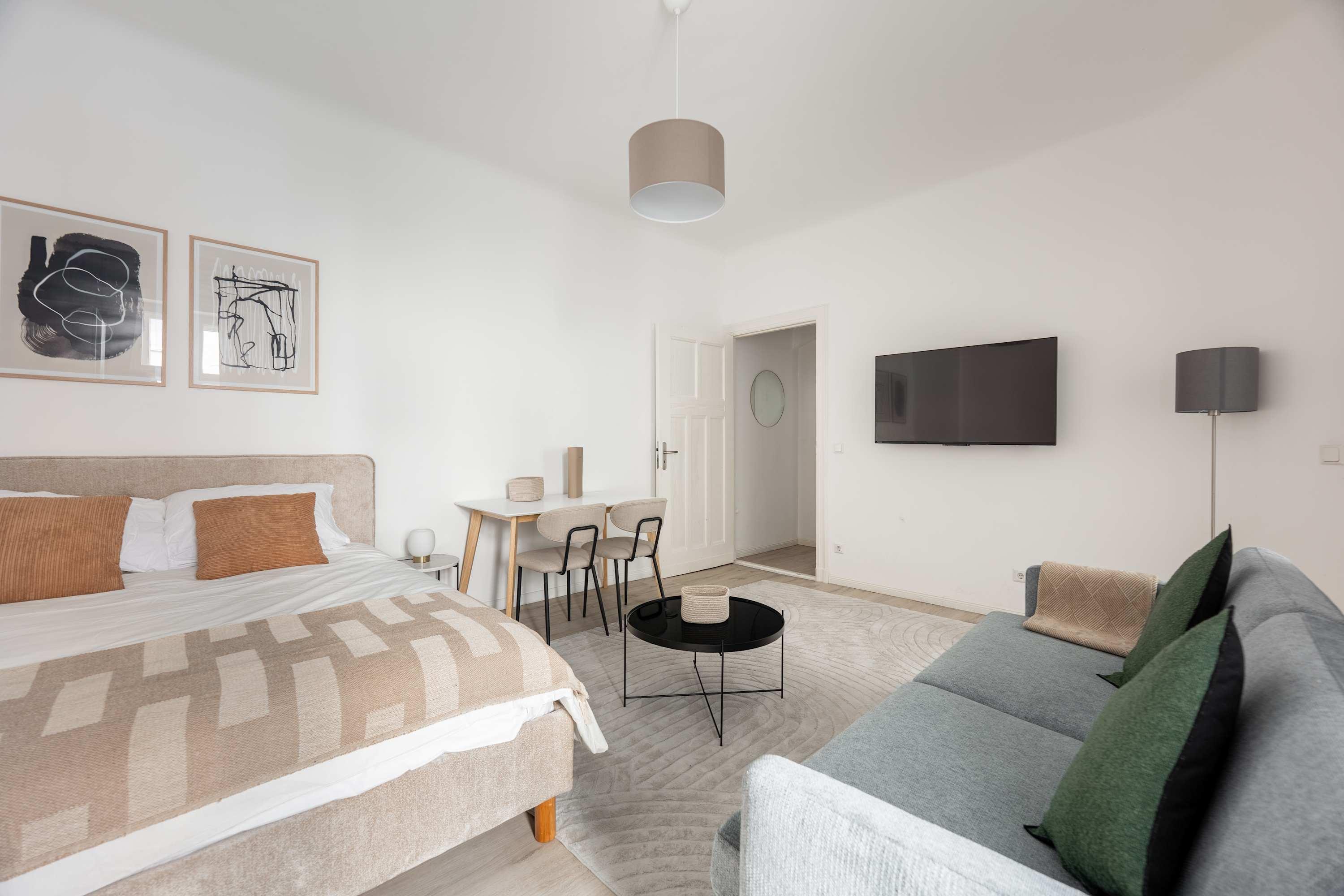 This stunning furnished studio apartment features contemporary design, a fully equipped kitchen, and a cozy living area with breathtaking views. Perfectly situated, you'll have easy access to everything that makes Berlin vibrant and exciting!