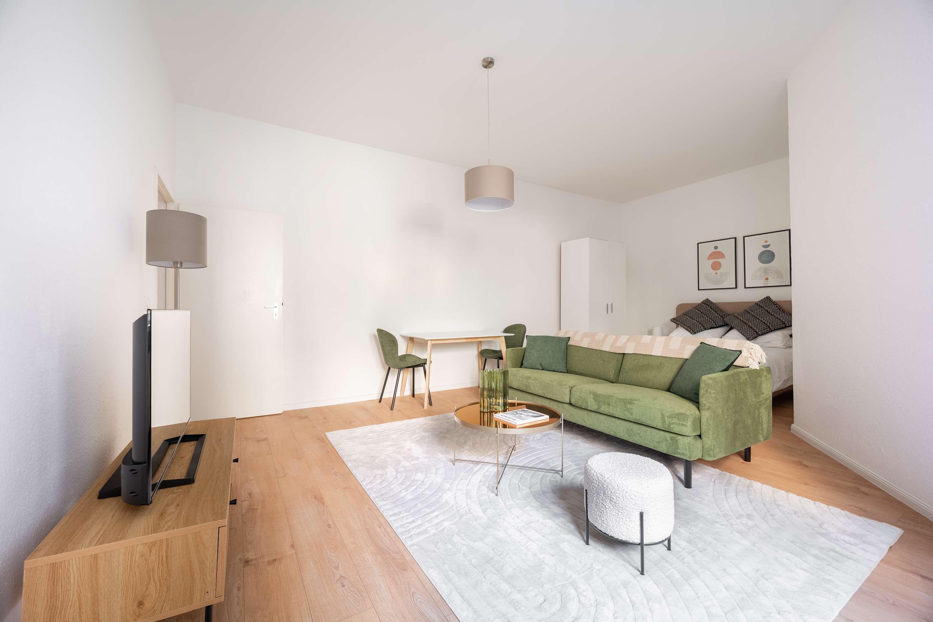 This stunning furnished studio apartment features contemporary design, a fully equipped kitchen, and a cozy living area with breathtaking views. Perfectly situated, you'll have easy access to everything that makes Berlin vibrant and exciting!