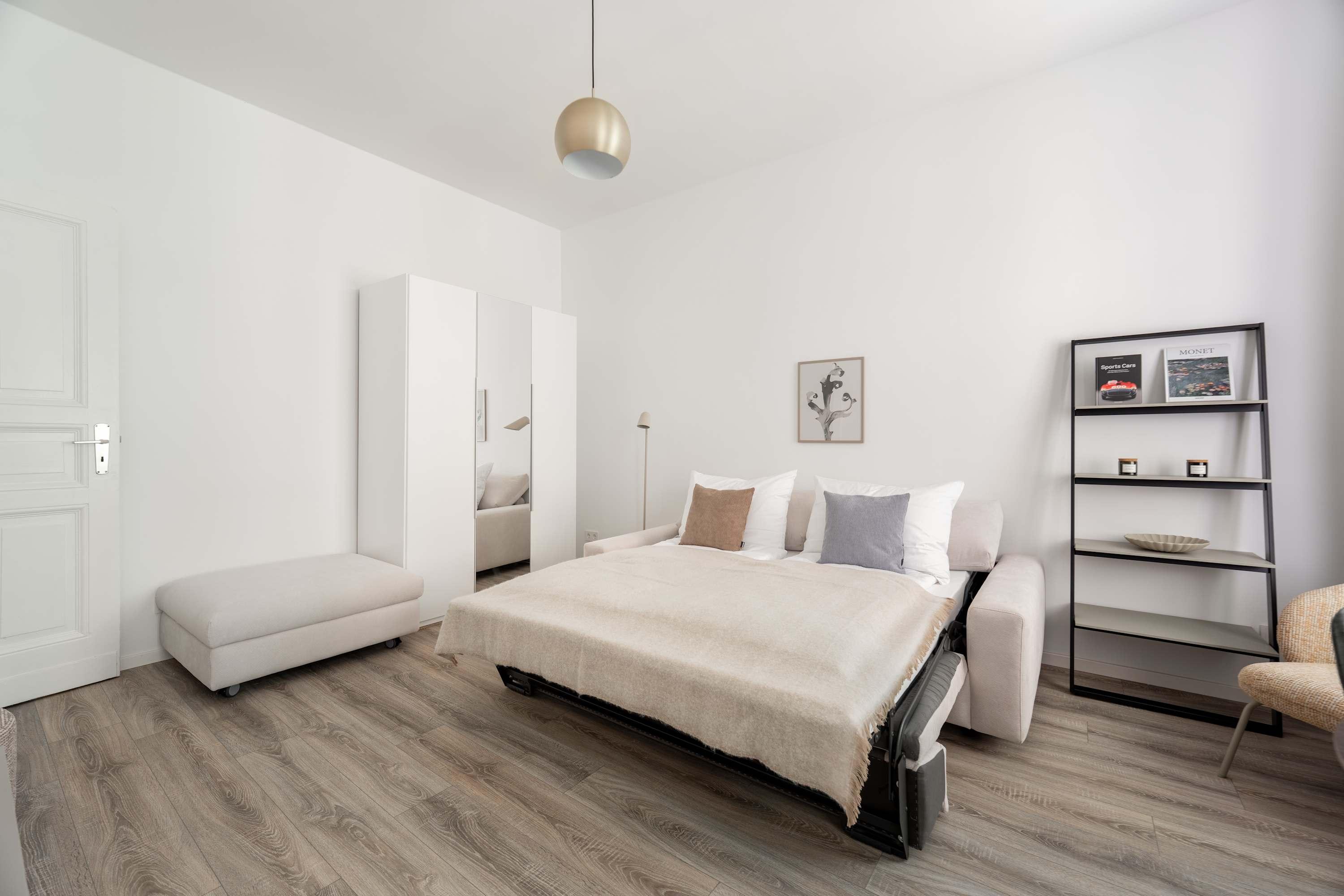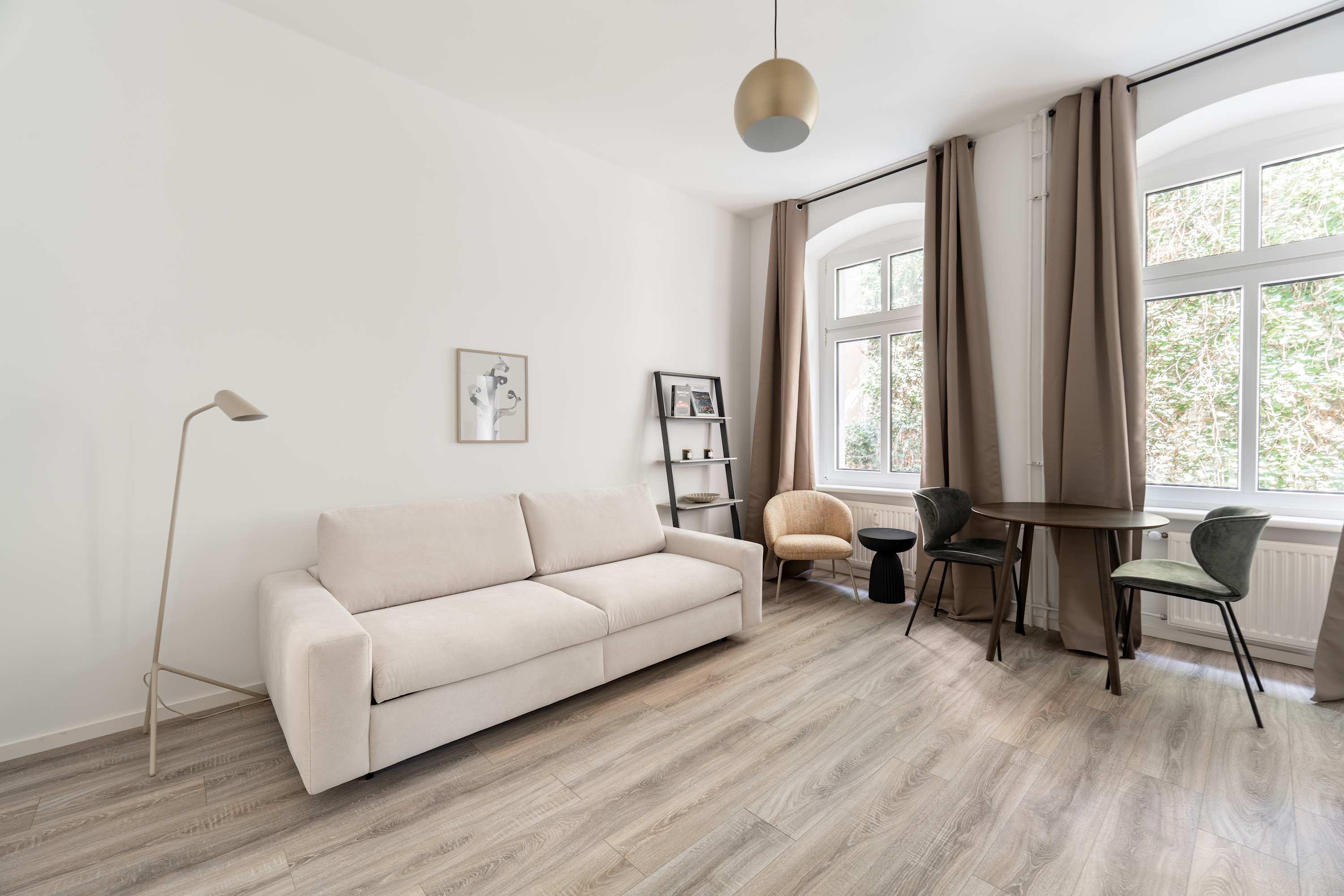 This stunning furnished studio apartment features contemporary design, a fully equipped kitchen, and a cozy living area with breathtaking views. Perfectly situated, you'll have easy access to everything that makes Berlin vibrant and exciting!