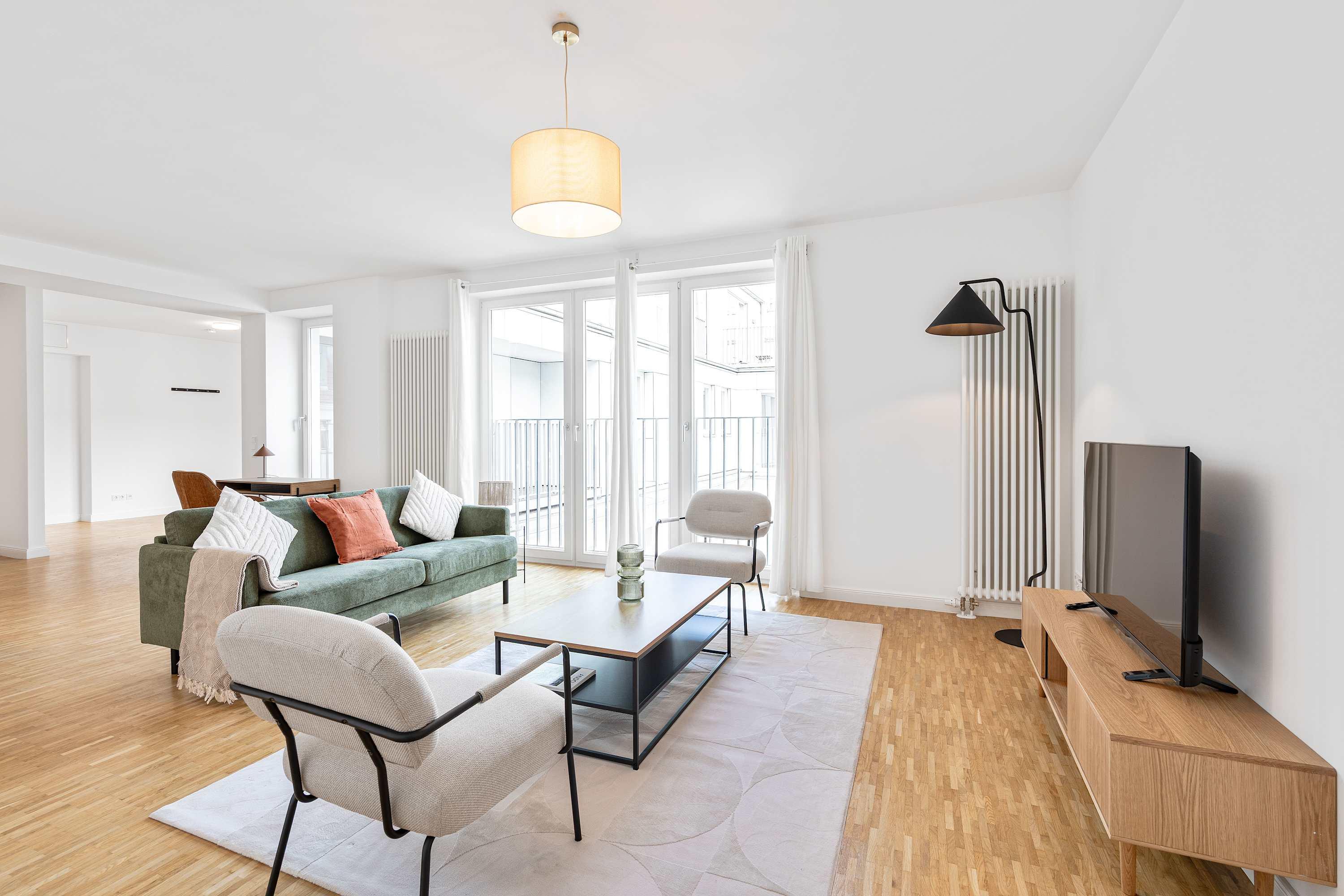 This stunning furnished two bedroom apartment features contemporary design, a fully equipped kitchen, and a cozy living area with breathtaking views. Perfectly situated, you'll have easy access to everything that makes Berlin vibrant and exciting!