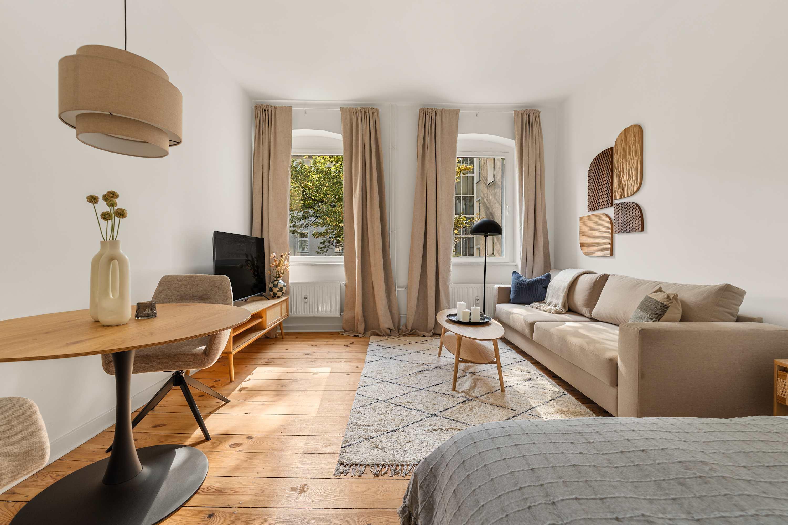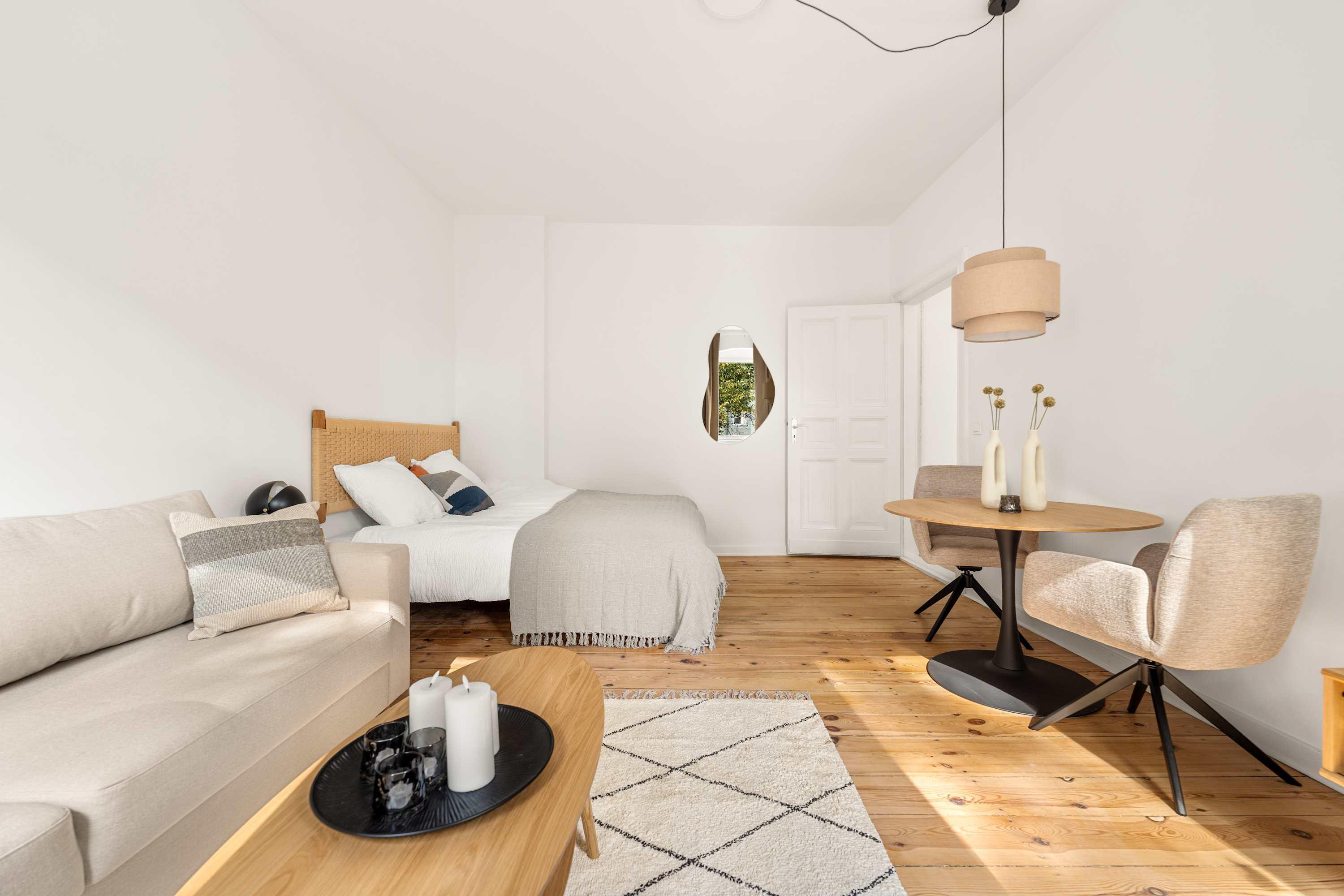 This stunning furnished studio apartment features contemporary design, a fully equipped kitchen, and a cozy living area with breathtaking views. Perfectly situated, you'll have easy access to everything that makes Berlin vibrant and exciting!