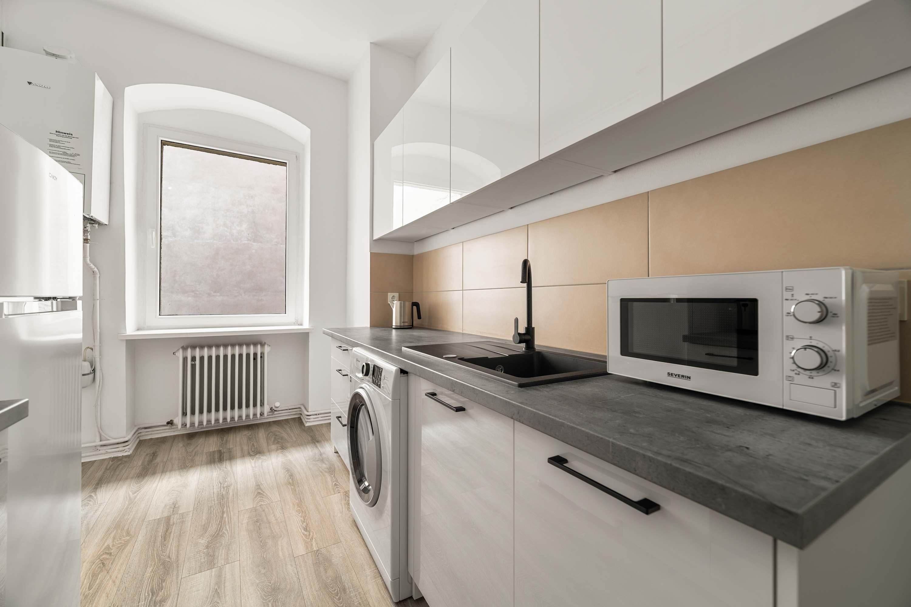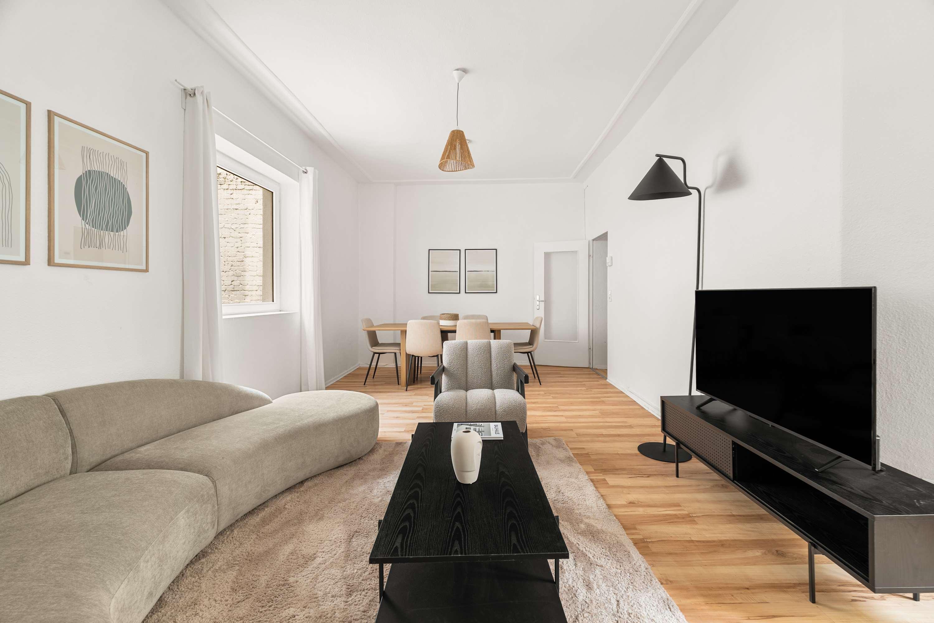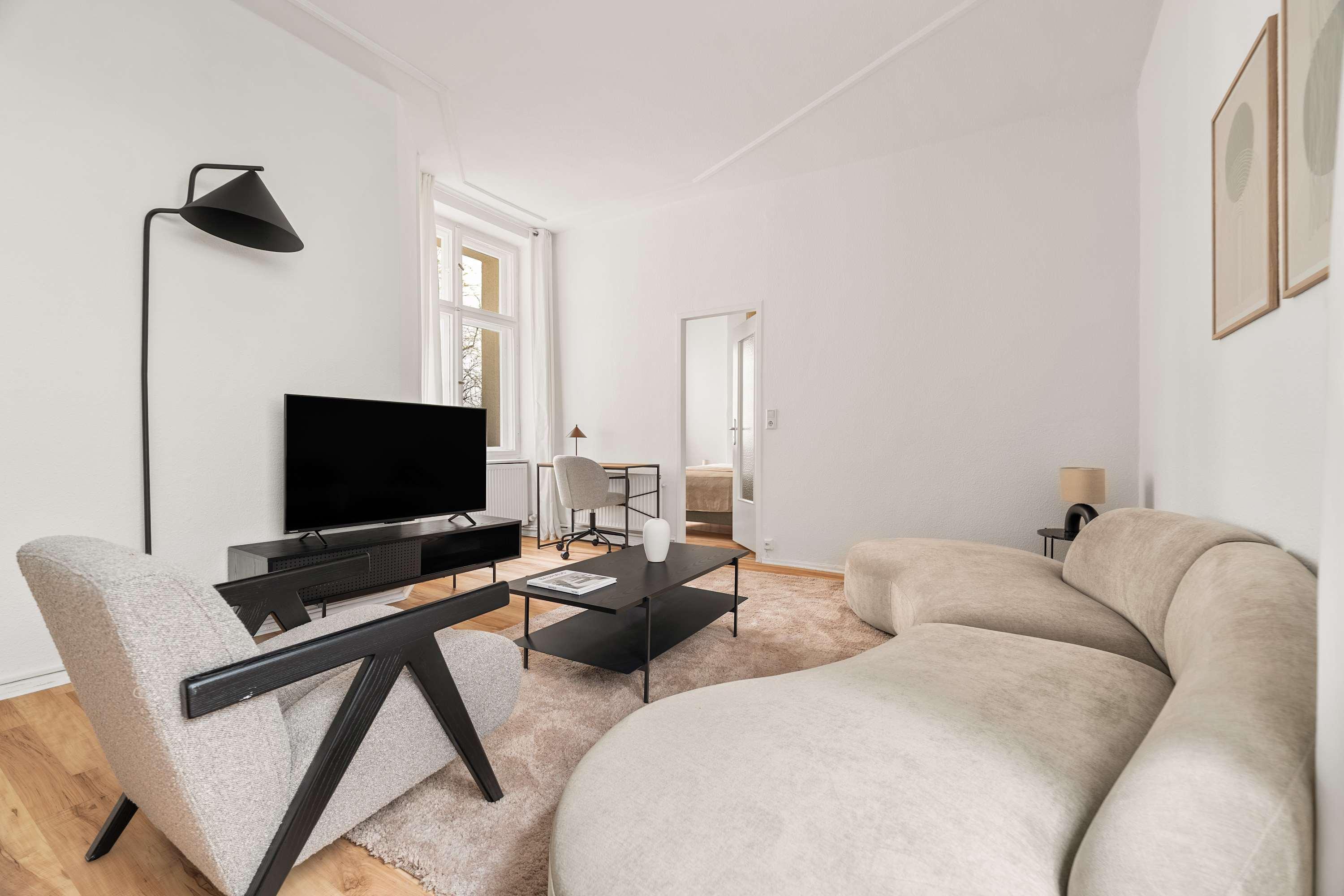 This stunning furnished two bedroom apartment features contemporary design, a fully equipped kitchen, and a cozy living area with breathtaking views. Perfectly situated, you'll have easy access to everything that makes Berlin vibrant and exciting!