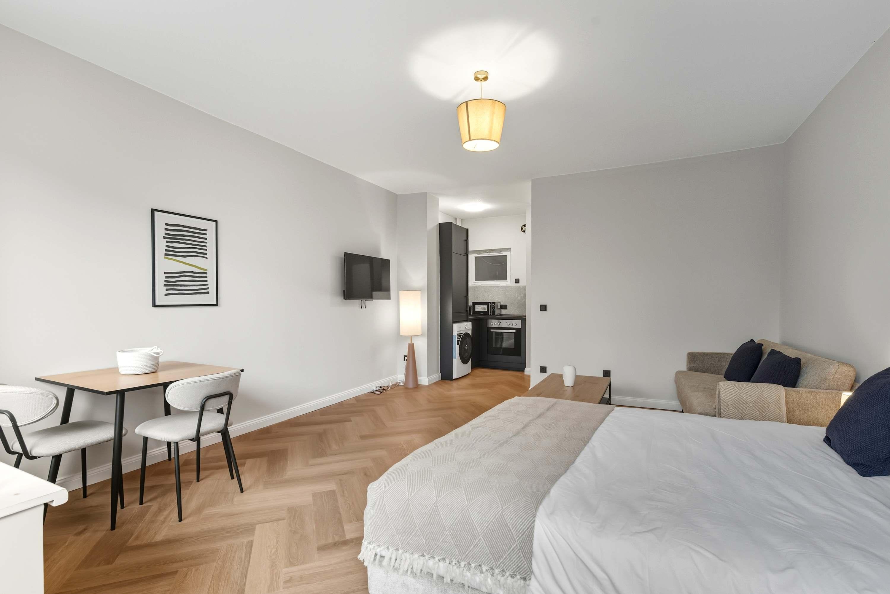 This stunning furnished studio apartment features contemporary design, a fully equipped kitchen, and a cozy living area with breathtaking views. Perfectly situated, you'll have easy access to everything that makes Berlin vibrant and exciting!