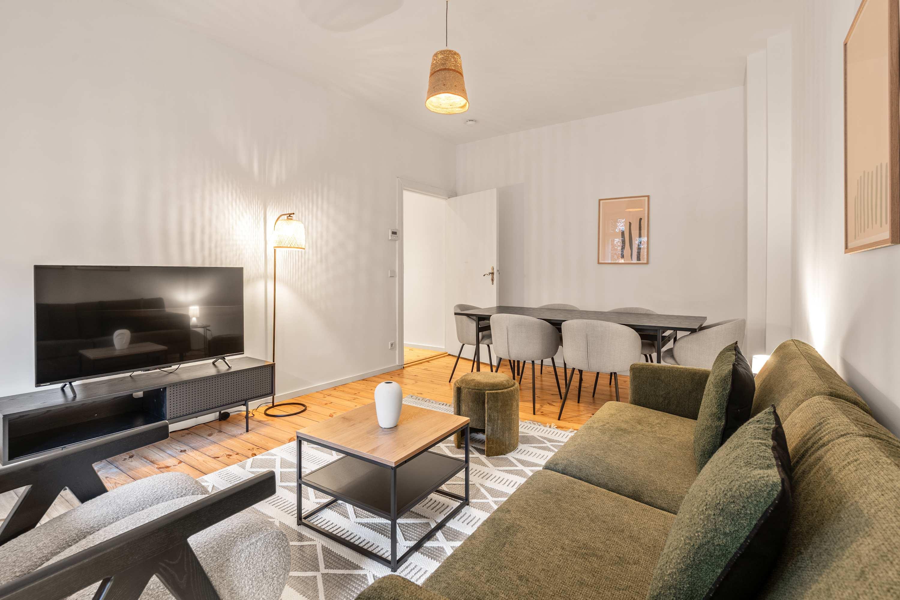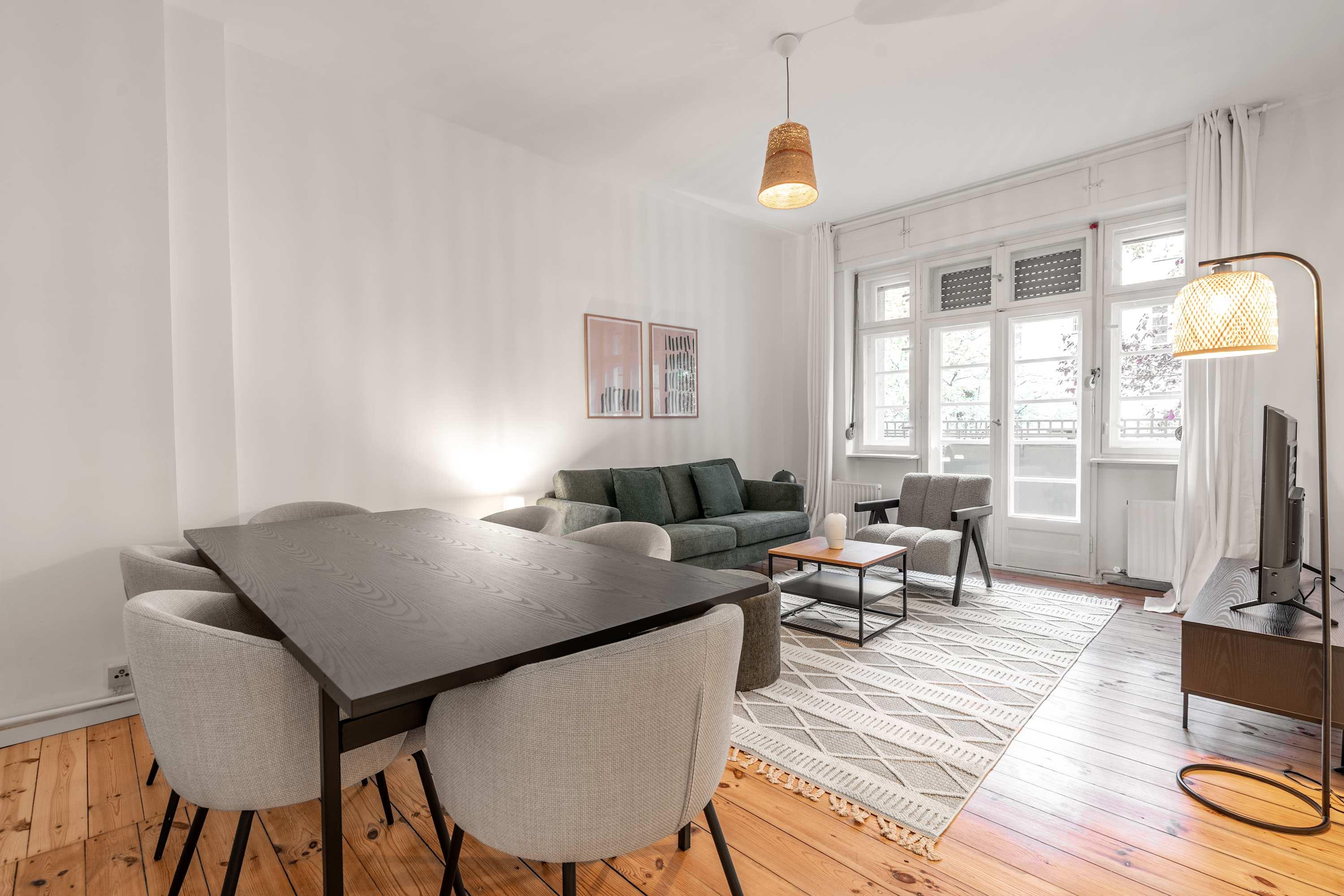 This stunning furnished three bedroom apartment features contemporary design, a fully equipped kitchen, and a cozy living area with breathtaking views. Perfectly situated, you'll have easy access to everything that makes Berlin vibrant and exciting!