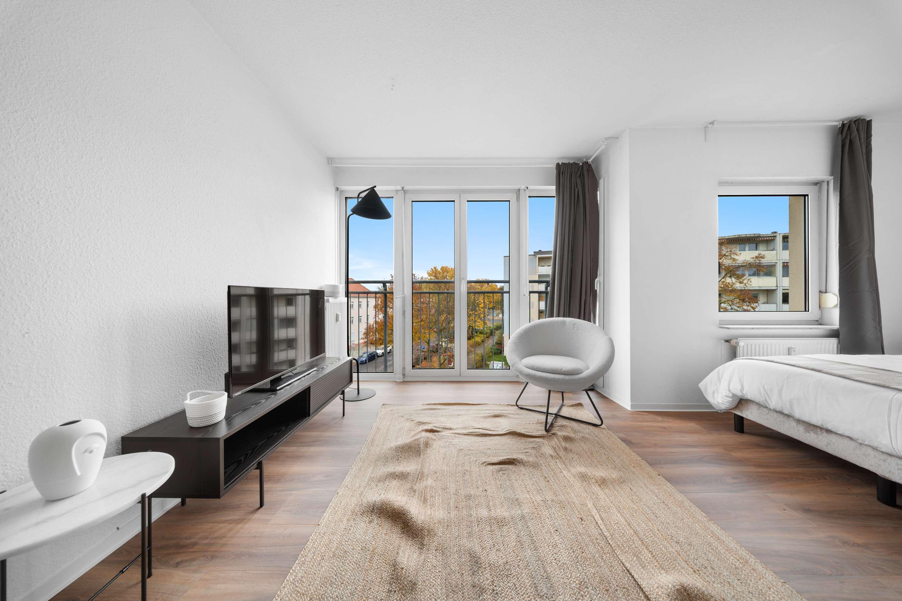 This stunning furnished studio apartment features contemporary design, a fully equipped kitchen, and a cozy living area with breathtaking views. Perfectly situated, you'll have easy access to everything that makes Berlin vibrant and exciting!