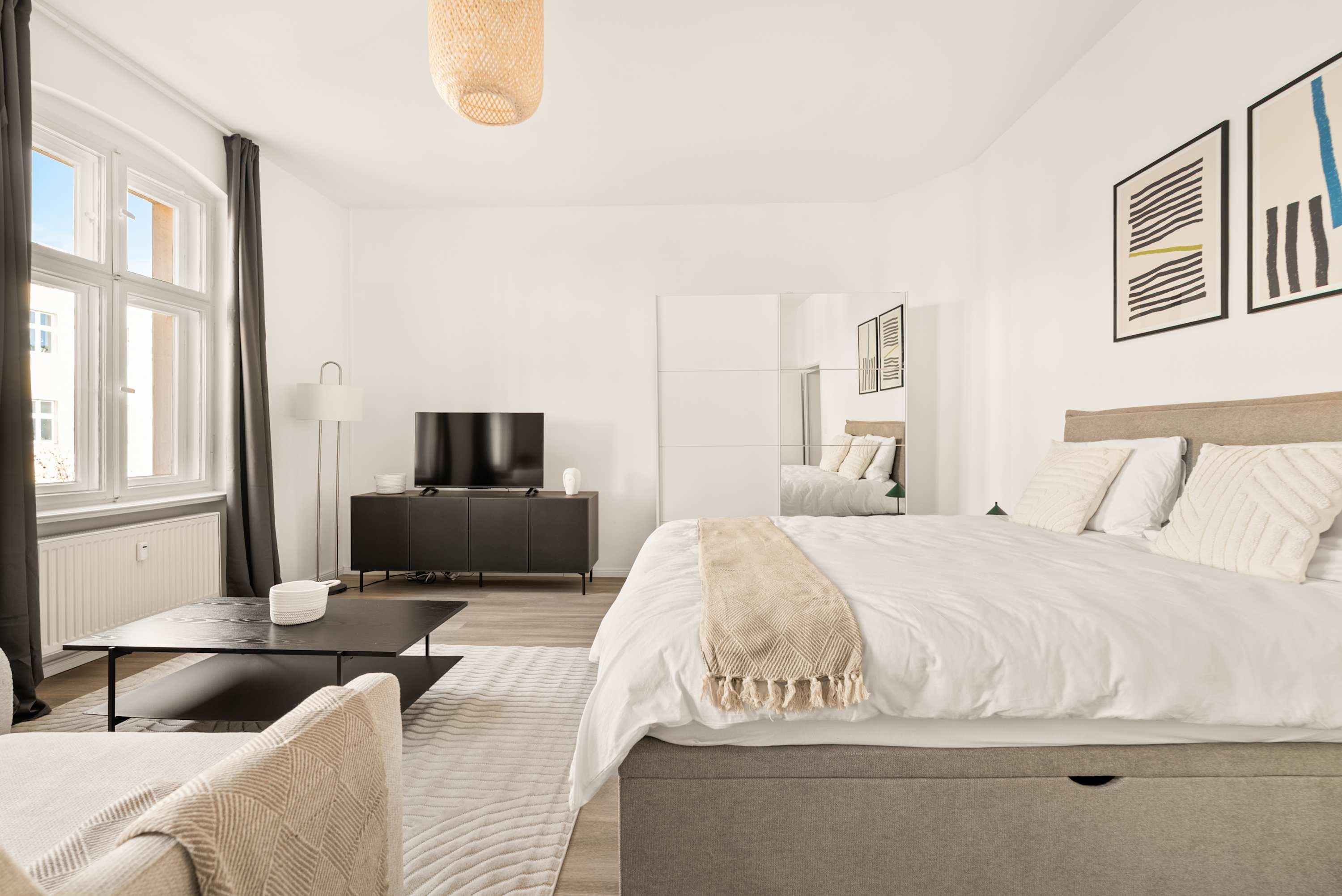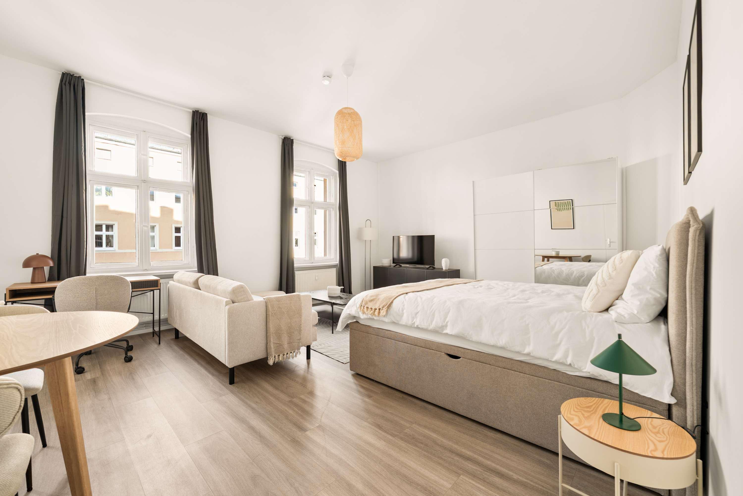 This stunning furnished studio apartment features contemporary design, a fully equipped kitchen, and a cozy living area with breathtaking views. Perfectly situated, you'll have easy access to everything that makes Berlin vibrant and exciting!