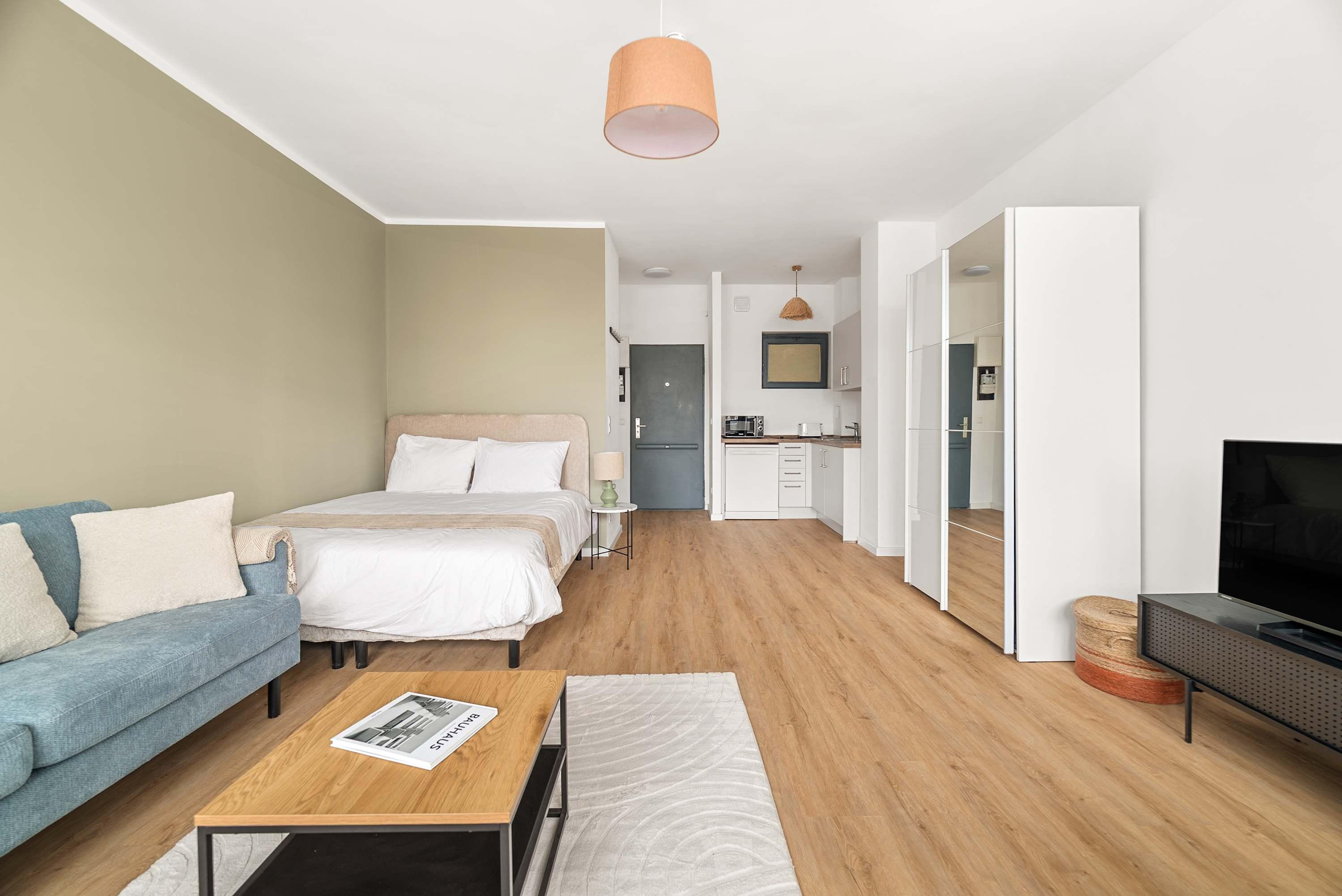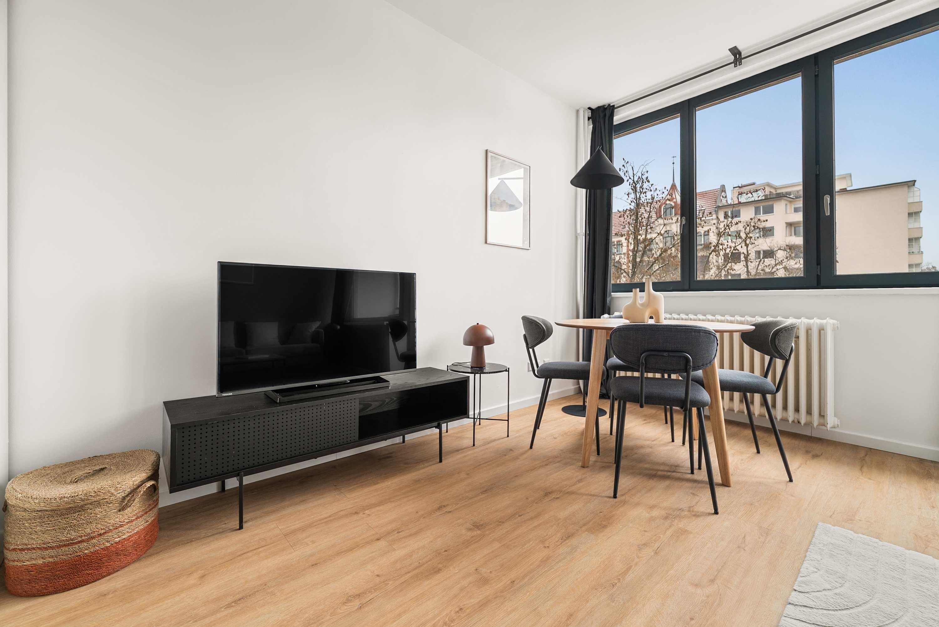 This stunning furnished studio apartment features contemporary design, a fully equipped kitchen, and a cozy living area with breathtaking views. Perfectly situated, you'll have easy access to everything that makes Berlin vibrant and exciting!