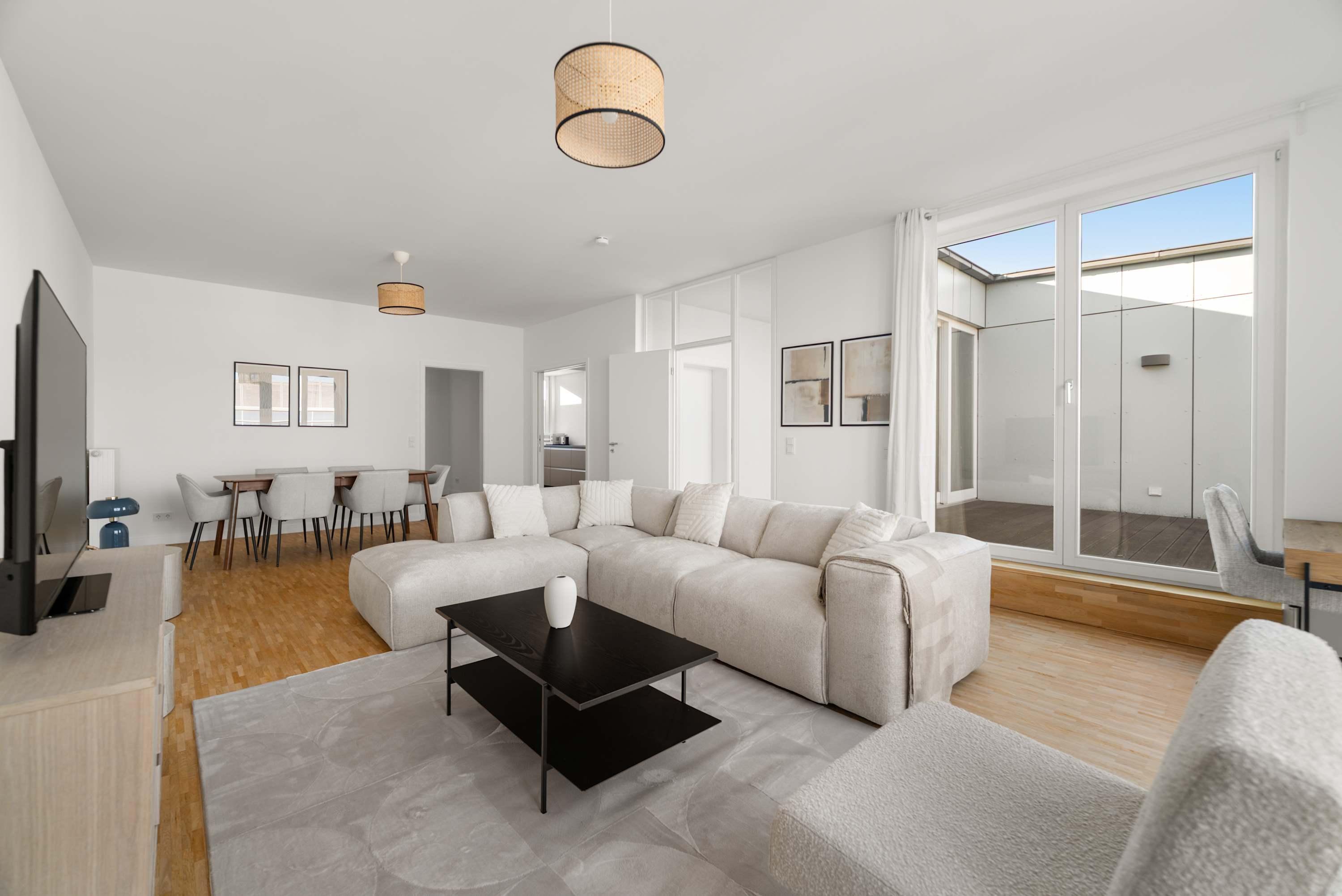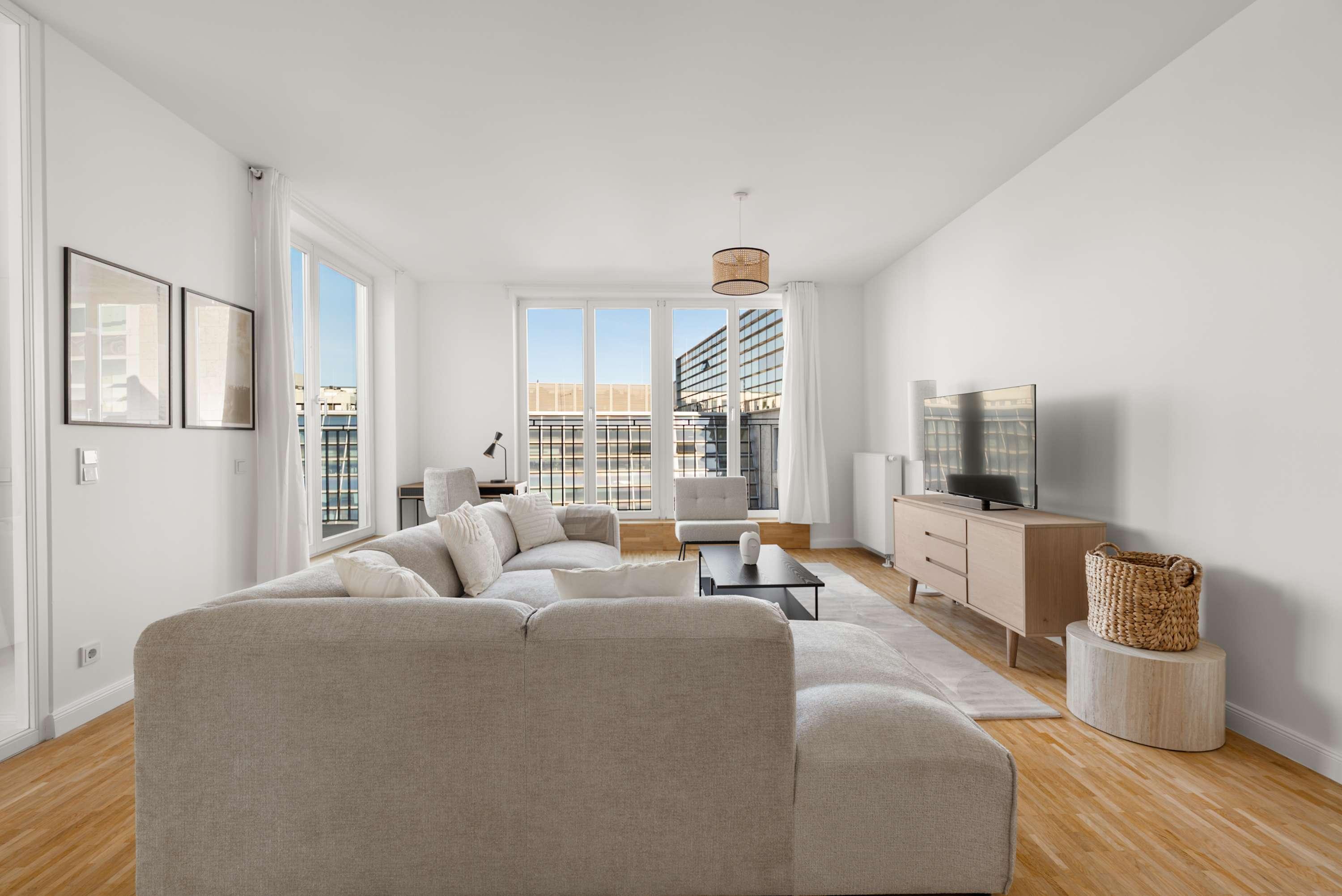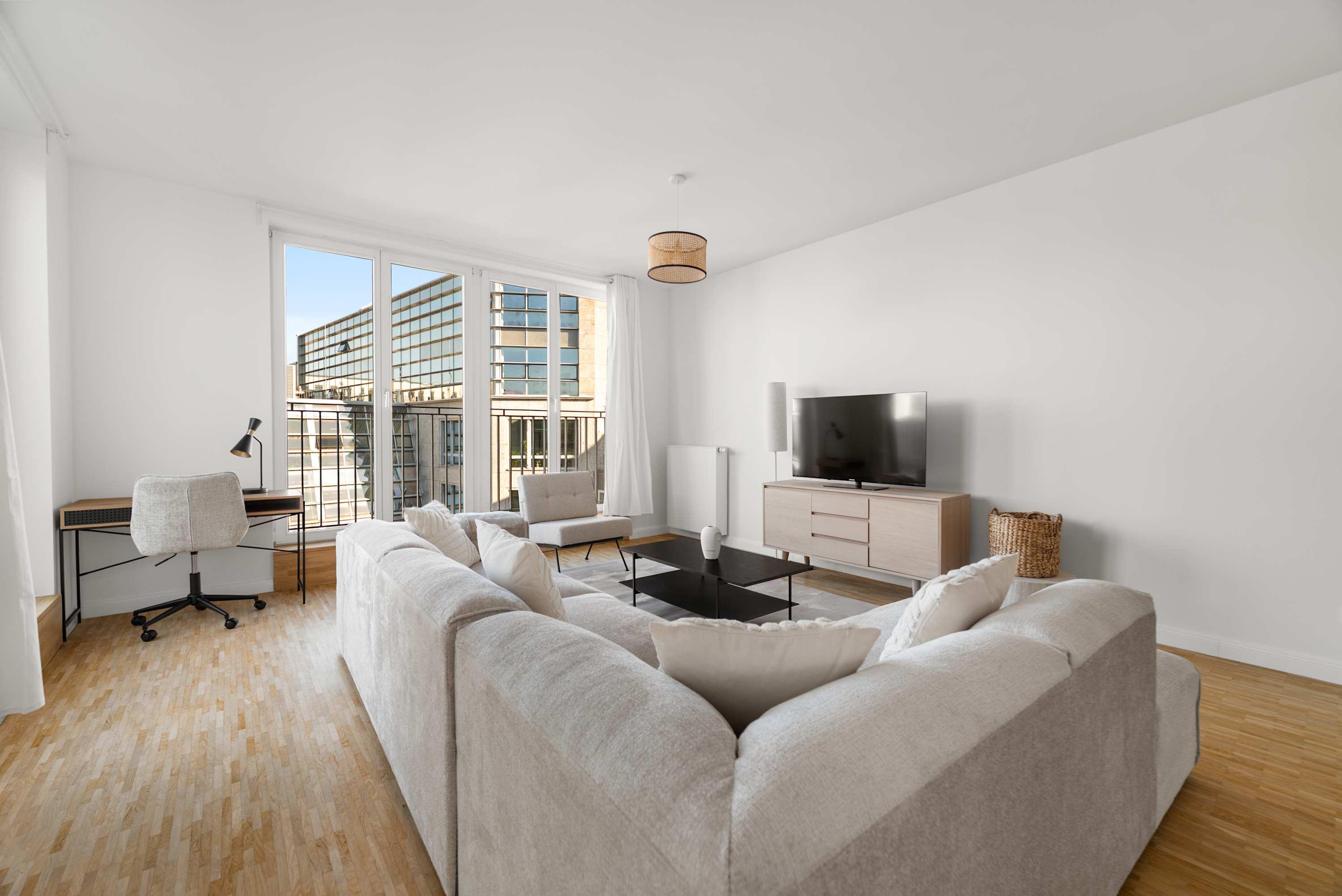 This stunning furnished two bedroom apartment features contemporary design, a fully equipped kitchen, and a cozy living area with breathtaking views. Perfectly situated, you'll have easy access to everything that makes Berlin vibrant and exciting!
