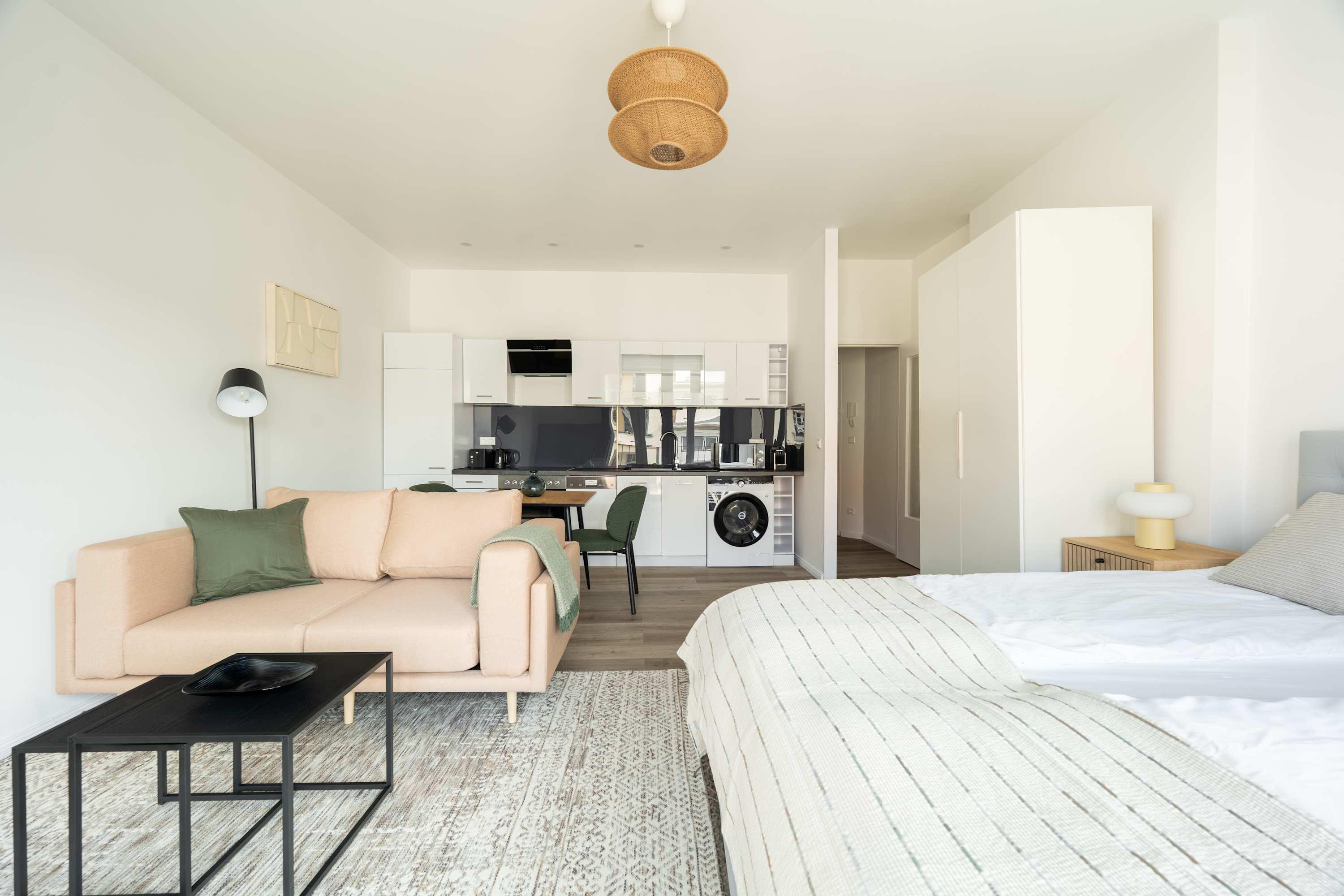 This stunning furnished studio apartment features contemporary design, a fully equipped kitchen, and a cozy living area with breathtaking views. Perfectly situated, you'll have easy access to everything that makes Berlin vibrant and exciting!