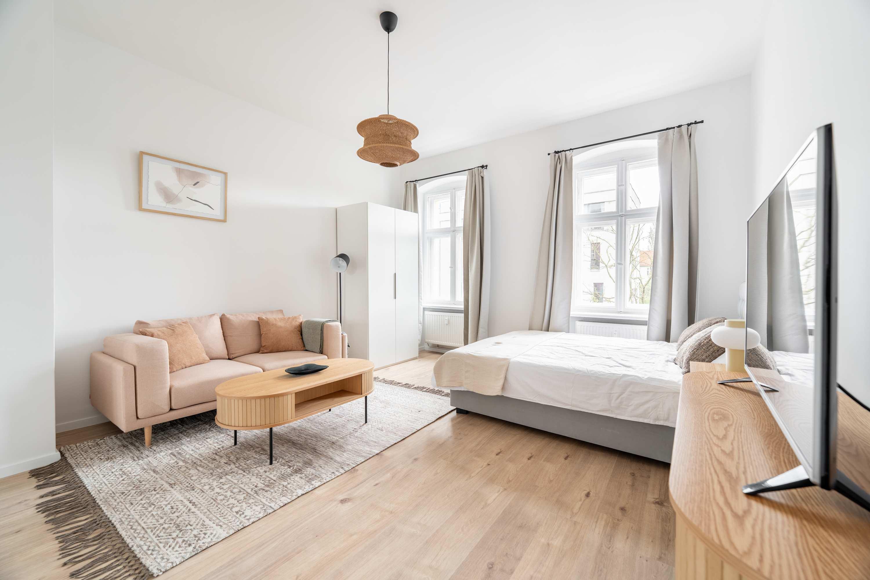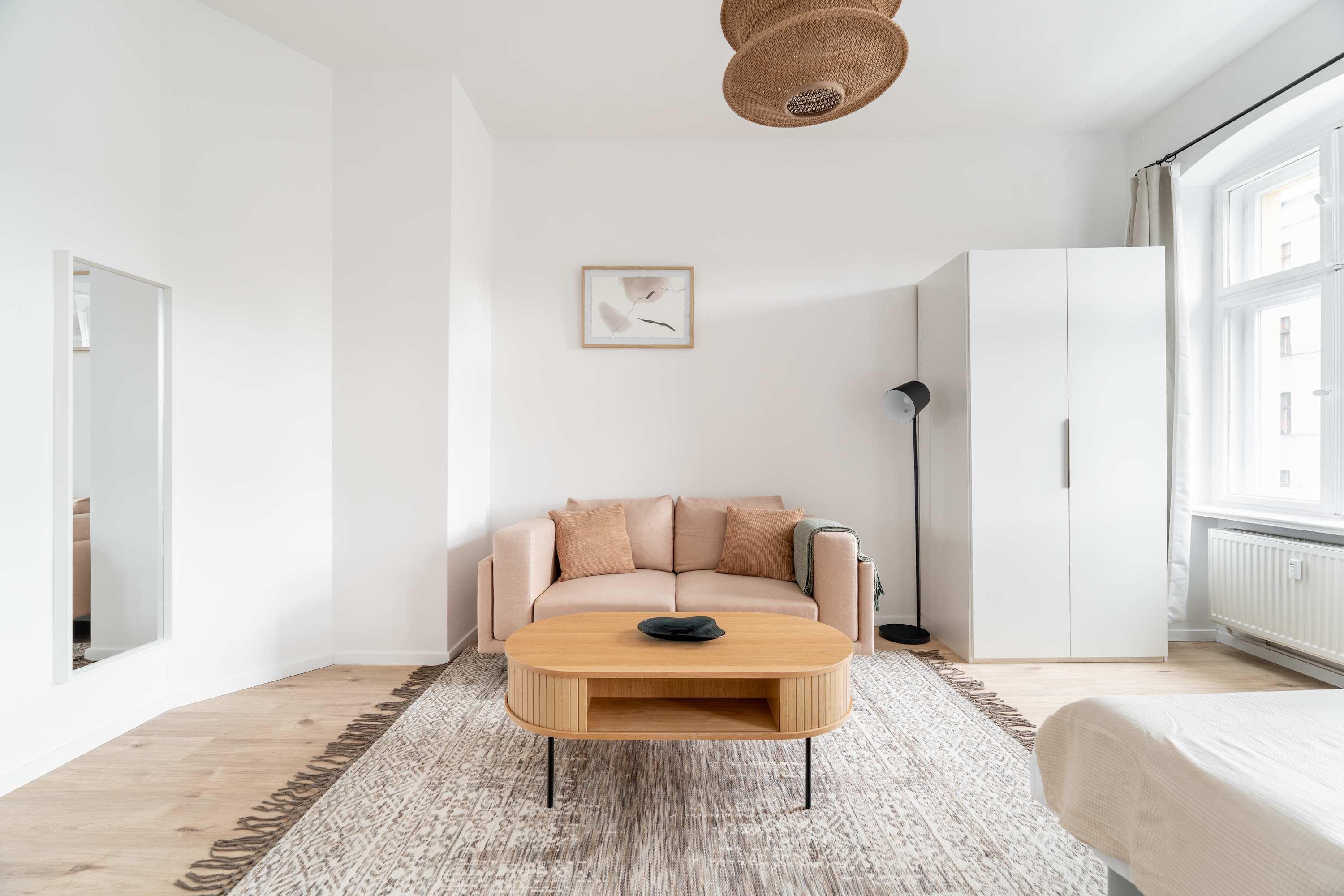 This stunning furnished studio apartment features contemporary design, a fully equipped kitchen, and a cozy living area with breathtaking views. Perfectly situated, you'll have easy access to everything that makes Berlin vibrant and exciting!